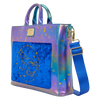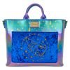 You'll find royal blue iridescent material covering the bag with gold foil stars, moons, and Mickeys! The front pocket features Sorcerer Mickey in gold embroidery against a crushed velvet background. This bag converts between a tote and a backpack, so you can wear it however you'd like!