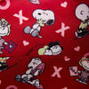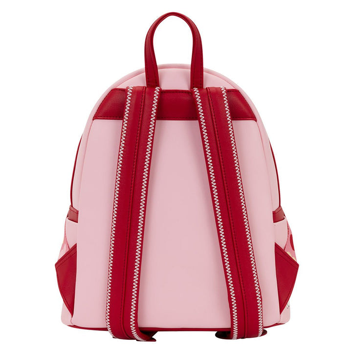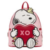 This pink and red mini backpack features Snoopy and Woodstock on the front. Snoopy hugs a heart-shaped valentine that doubles as the front pocket. Find more images of Snoopy and Woodstock on the side pockets with hearts and valentines. Turn the bag around to find an "X" and "O" on the straps!
