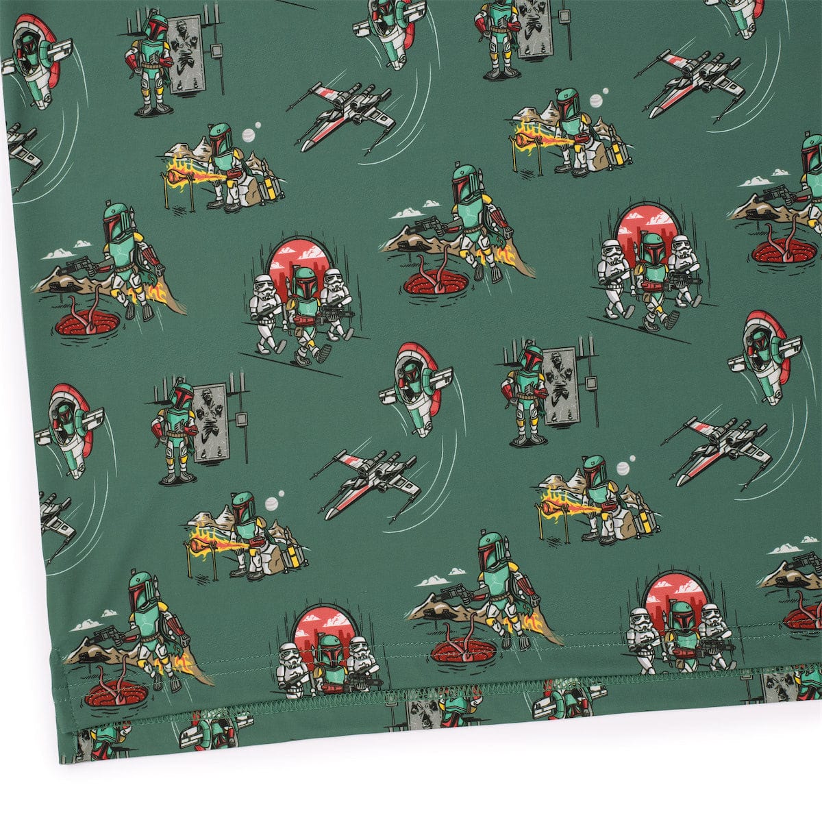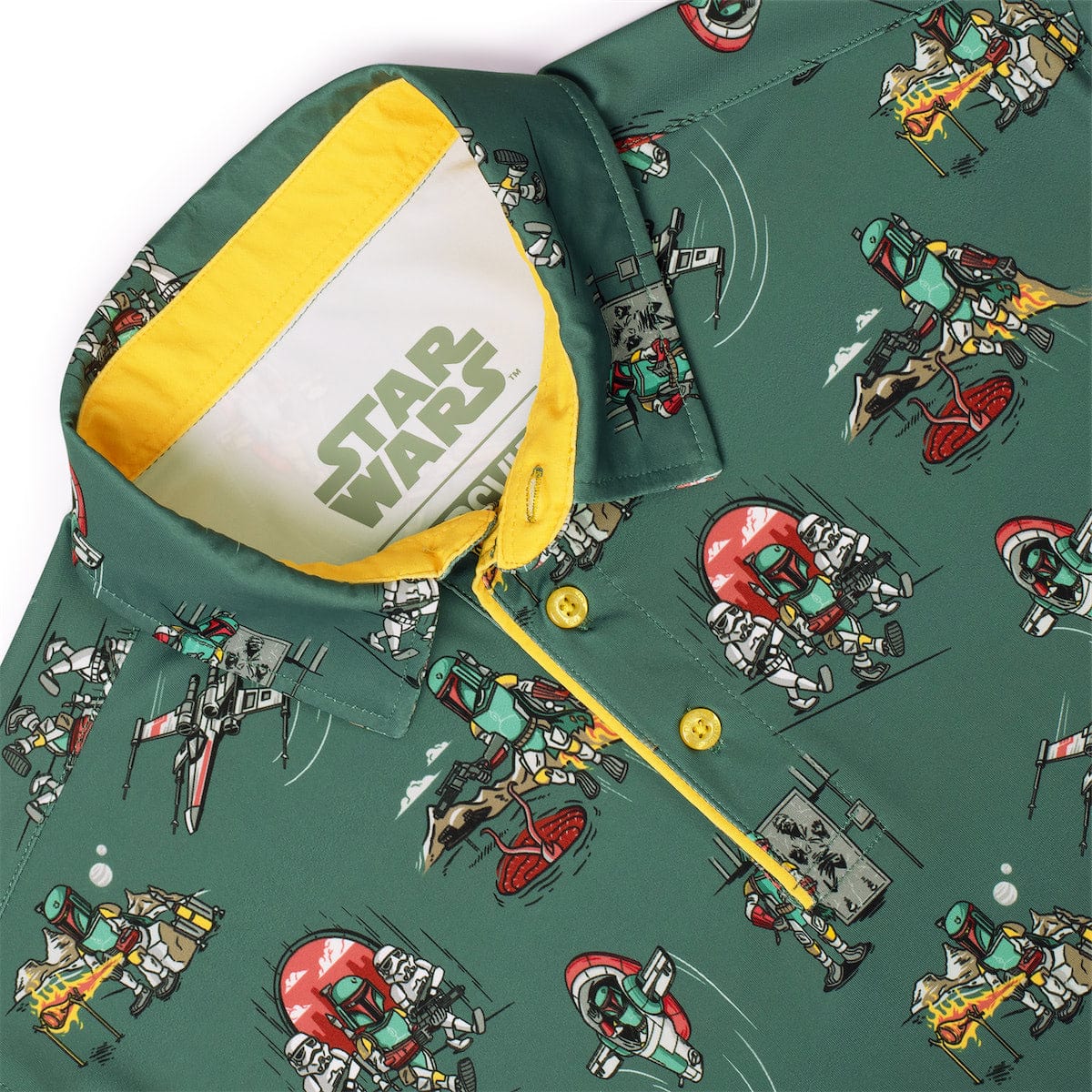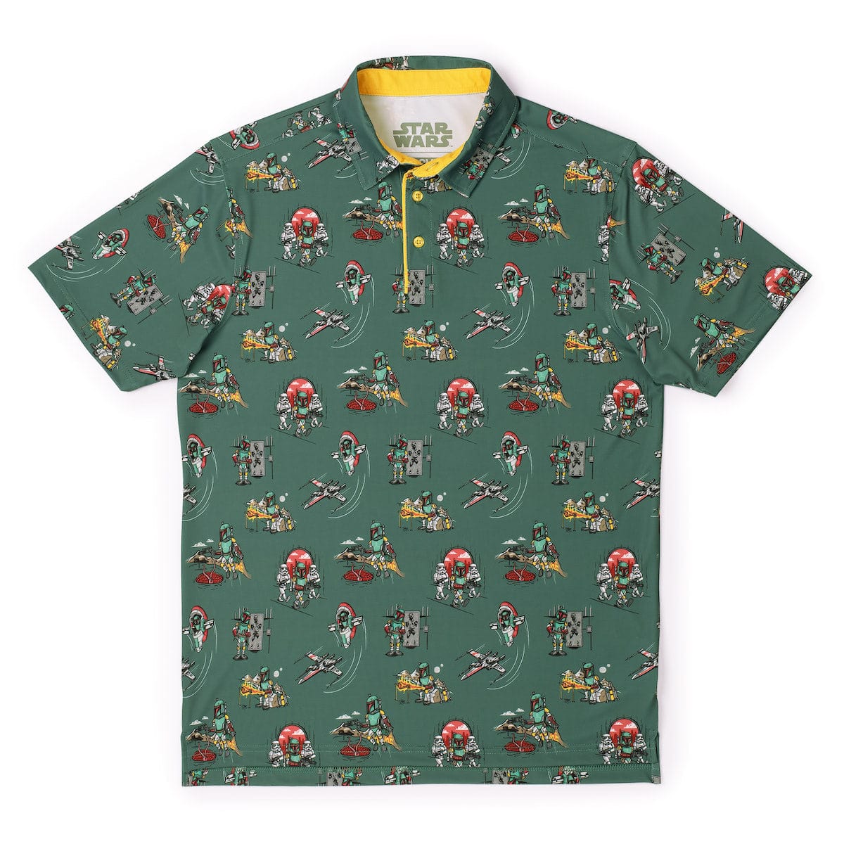 Boba Fett, the famed and feared bounty hunter in Mandalorian armor, had his share of adventures around the galaxy in the original Star Wars™ films. This soft & stretchy All-Day™ polo recreates some of his most iconic moments—from Sarlacc Pit dust-ups to a Han Solo carbon-freeze—in a colorful cartoon-styling. It's Boba Fett like you've never seen him before! Well, except on our popular KUNUFLEX™ version of this design.