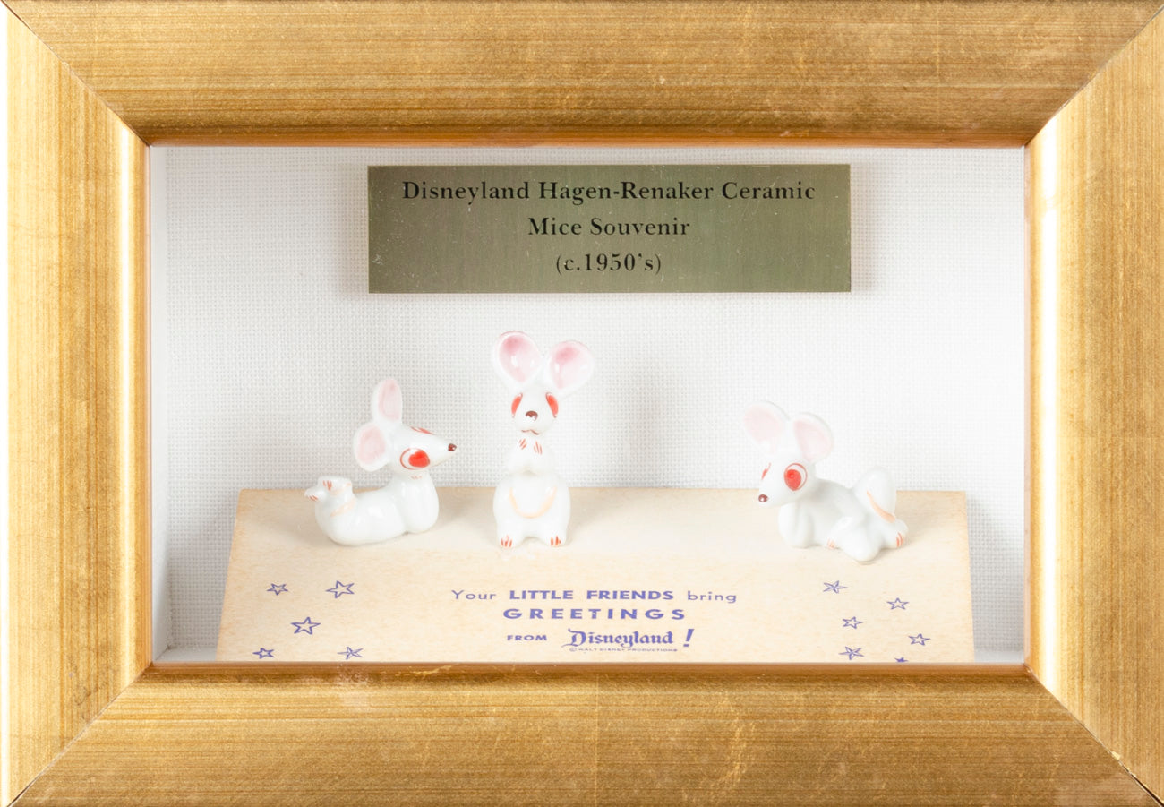 A Disneyland Ceramic Mice Set Souvenir by Hagen-Renaker. During the early years of Disneyland, shops like Ruggles China and Glass House Shop offered unique pieces of souvenir merchandise. Measuring 5.5"x2.5", this carded set of ceramic miniatures is in fine condition with minor discoloration and wear to the card.