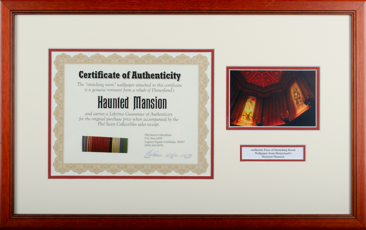 "Is this room actually stretching? Or is it just your imagination?" This genuine piece of Haunted Mansion stretching portrait gallery wallpaper comes from a recent rehab of the ride and hopefully no spirits will follow you home!