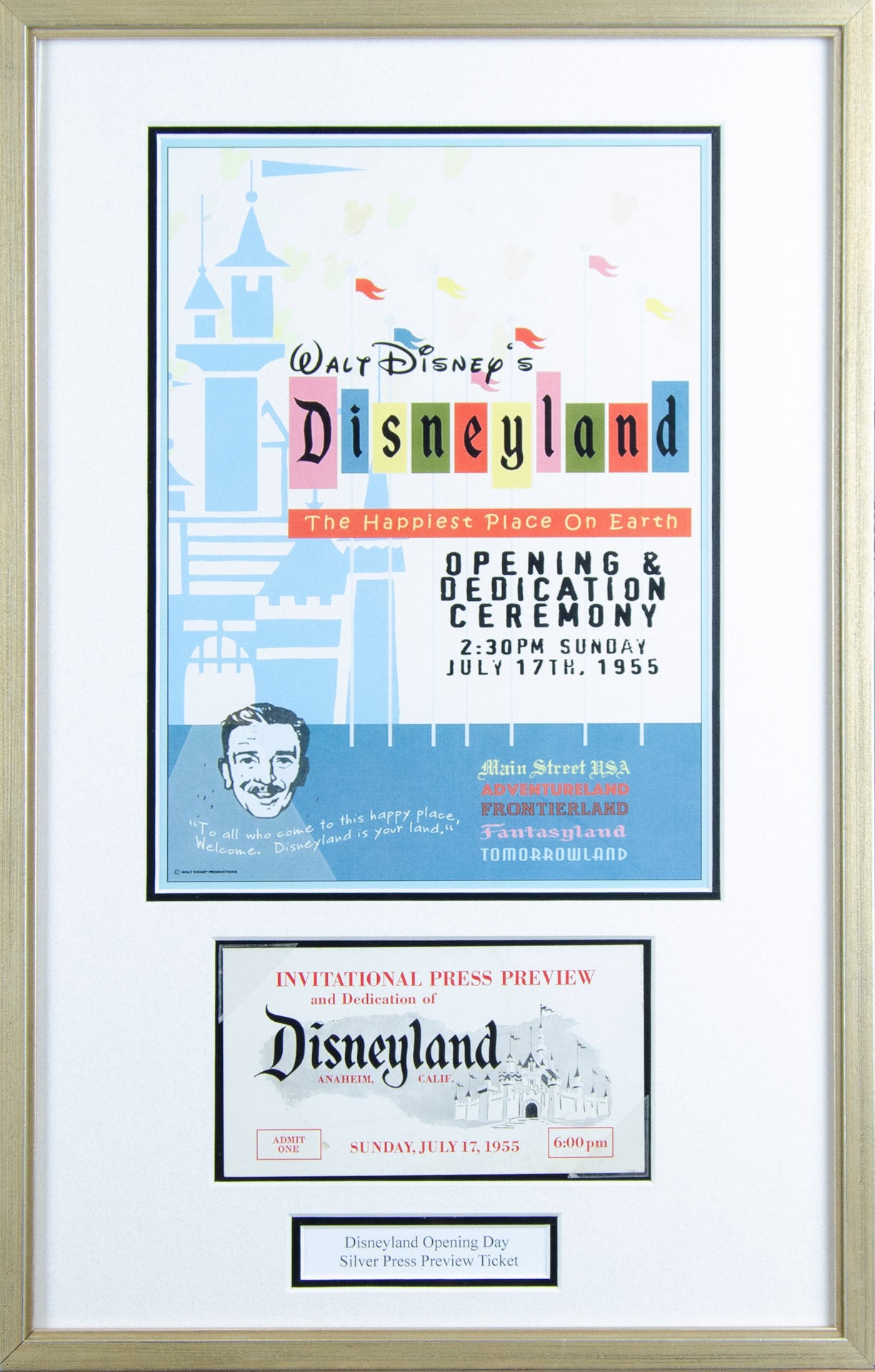 (Disneyland, 1955) A very rare white opening day press preview ticket. Because Disneyland's opening day events were broadcast on live TV, guests and VIPs were requested to arrive at different times to accommodate the televised ceremonies This particular pass features a seldom seen entrance time of 6:00pm, which would be after the broadcast had concluded, and includes information on the reverse about ABC's broadcast of the events. There is a line on the reverse for the original user to sign, but this pass has not been filled in. The ticket measures 3.5"x6.5" and is in good condition.