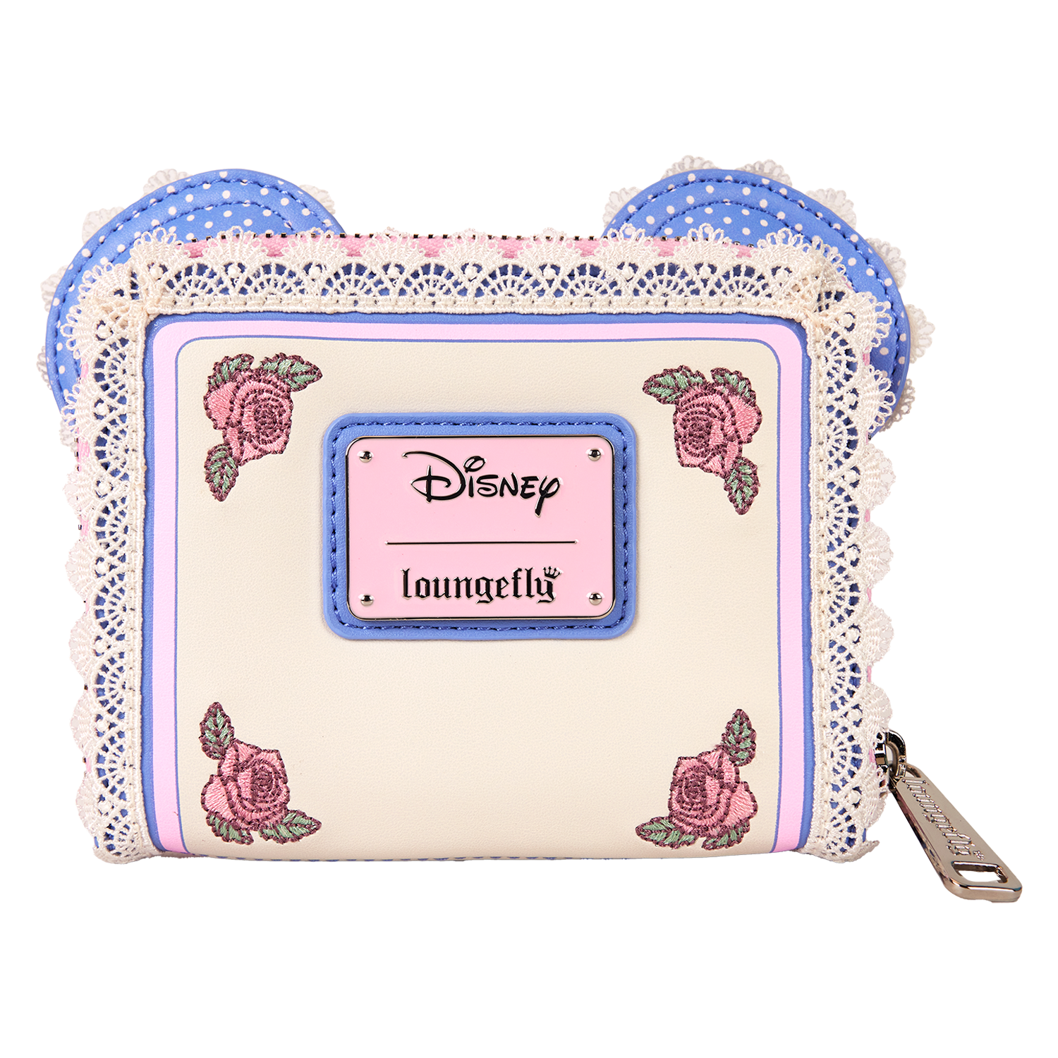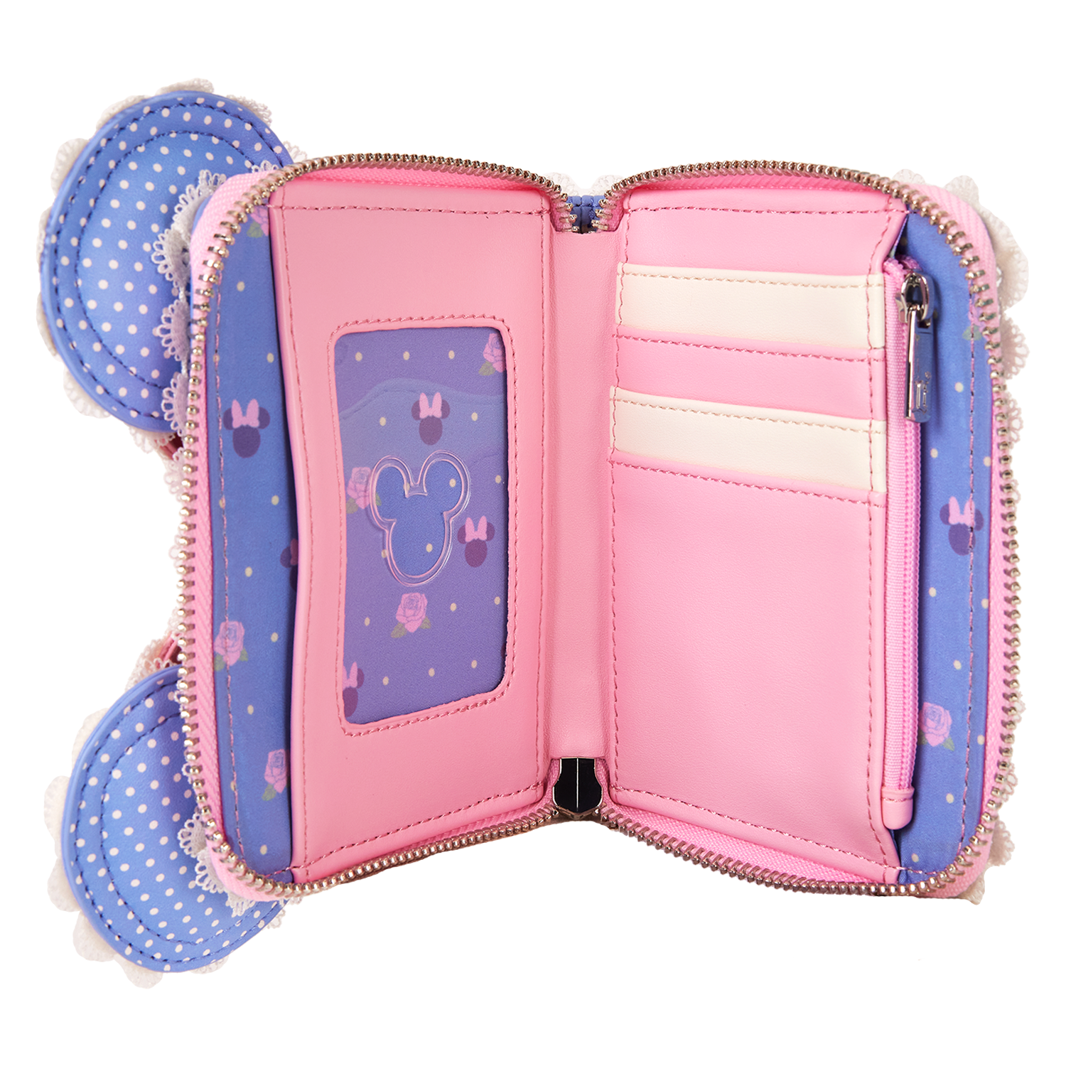 Fashion is in full bloom with this Disney’s Minnie Mouse zip-around wallet. Special Minnie Mouse flourishes make this accessory extra charming. Her applique ears, decorated with a polka dot print, pop up over the top, and lace trim adds a delicate touch. There’s a pink 3D bow in the middle, and embroidered roses unfurl in decorative detail. Secure your valuables for the day, take off on an adventure, and watch the fun blossom.