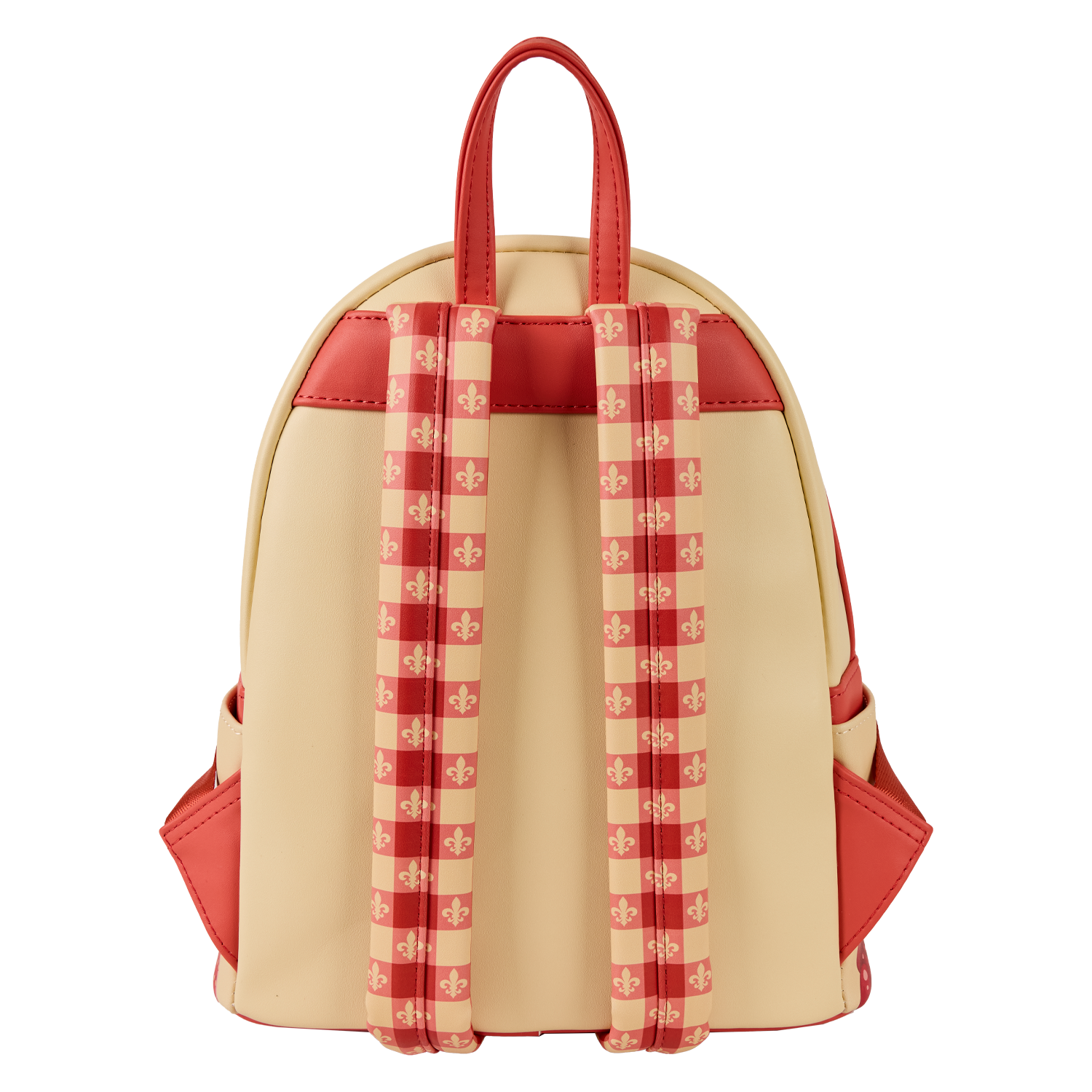 This mini backpack brings a gourmet feast to life – you'll find Remy laying on a block of cheese that doubles as the front pocket. He spins on a rivet. Surrounding him are appliques of apple slices, grapes, strawberries, and baguettes!