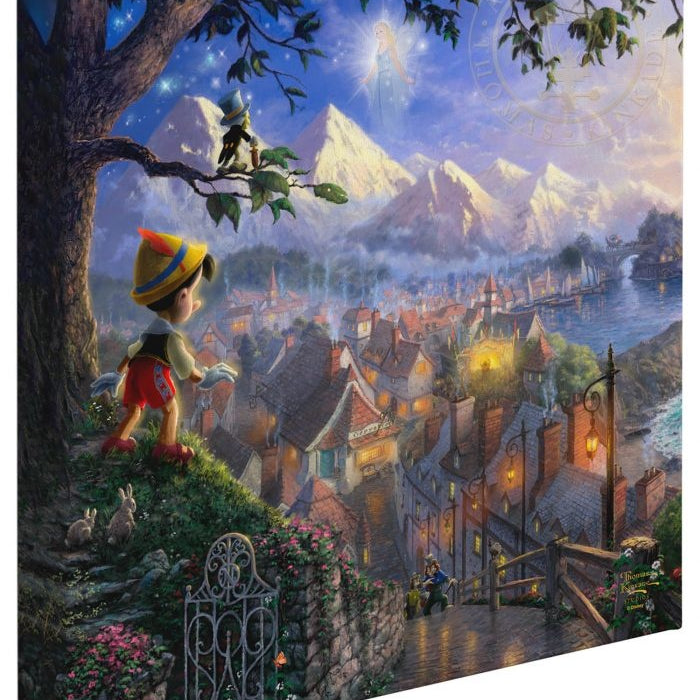 Gallery Wrapped Canvas Giclee Print from Thomas Kinkade StudioSize: 14 x 14Certificate of Authenticity Included IMAGE NOTESMy Disney Dreams Collection celebrates great moments from Walt Disney Films. I call these paintings "narrative panoramas" because each painting tells the entire story of the film in one image.For my painting Pinocchio Wishes Upon A Star we see Pinocchio upon a hillside overlooking the setting of his adventures. We see Honest John and Geppetto's workshop where Pinocchio was formed. On the right we see Pleasure Island and Monstro the whale preparing to engulf Geppetto's sailing vessel. Butterflies and sparkles lend magical accents as the Blue Fairy and Jiminy Cricket look on.My prayer is that my Disney Dreams Collection will make dreams come true for all who see these enchanted paintings.