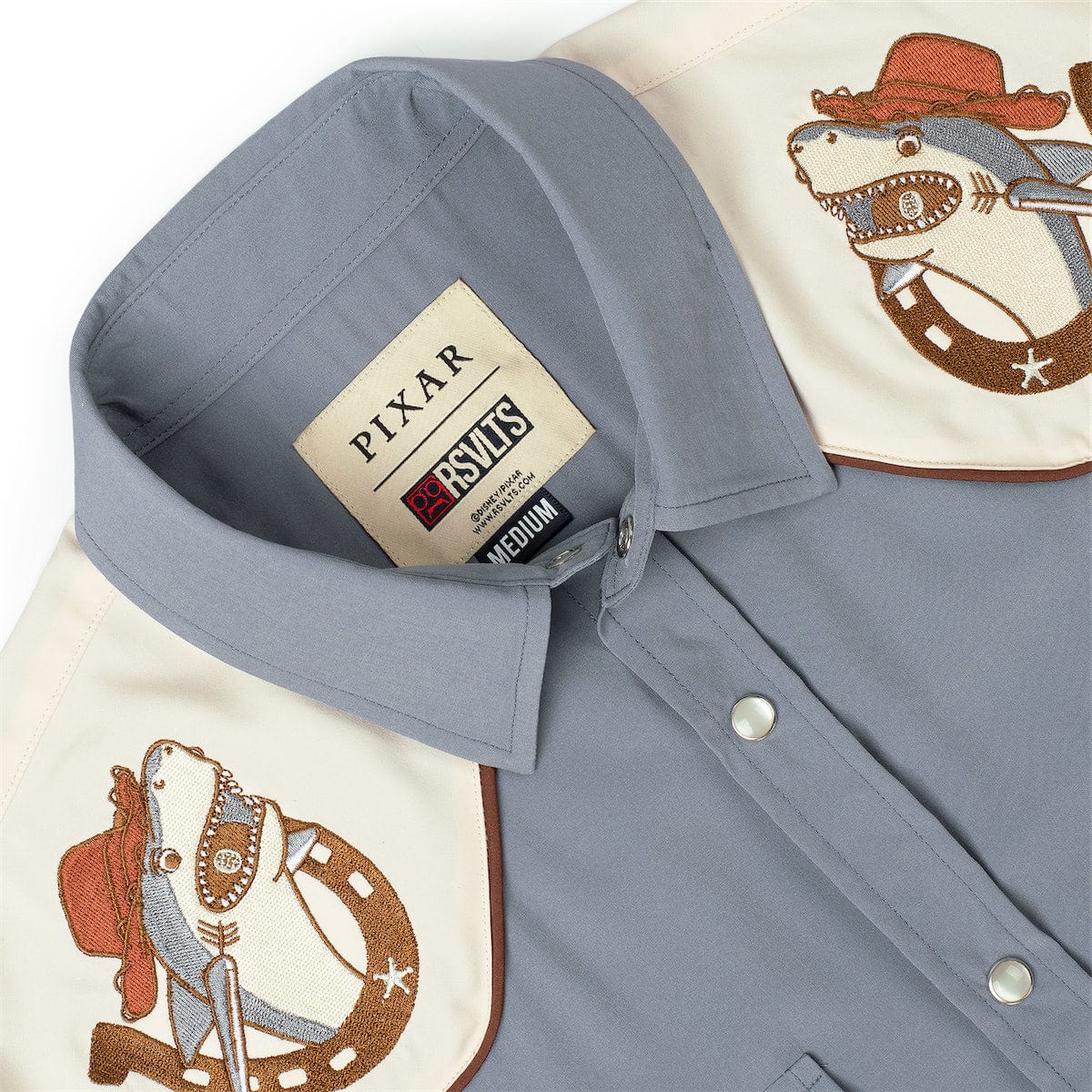 The toy shark who (momentarily) stole his sheriff buddy’s hat is featured on the front of this western-themed roper while his laugh-wranglin’ quote steals the show on the back. Hey, when a great white has jokes, there’s not much you can do but take it in stride, cowboy.