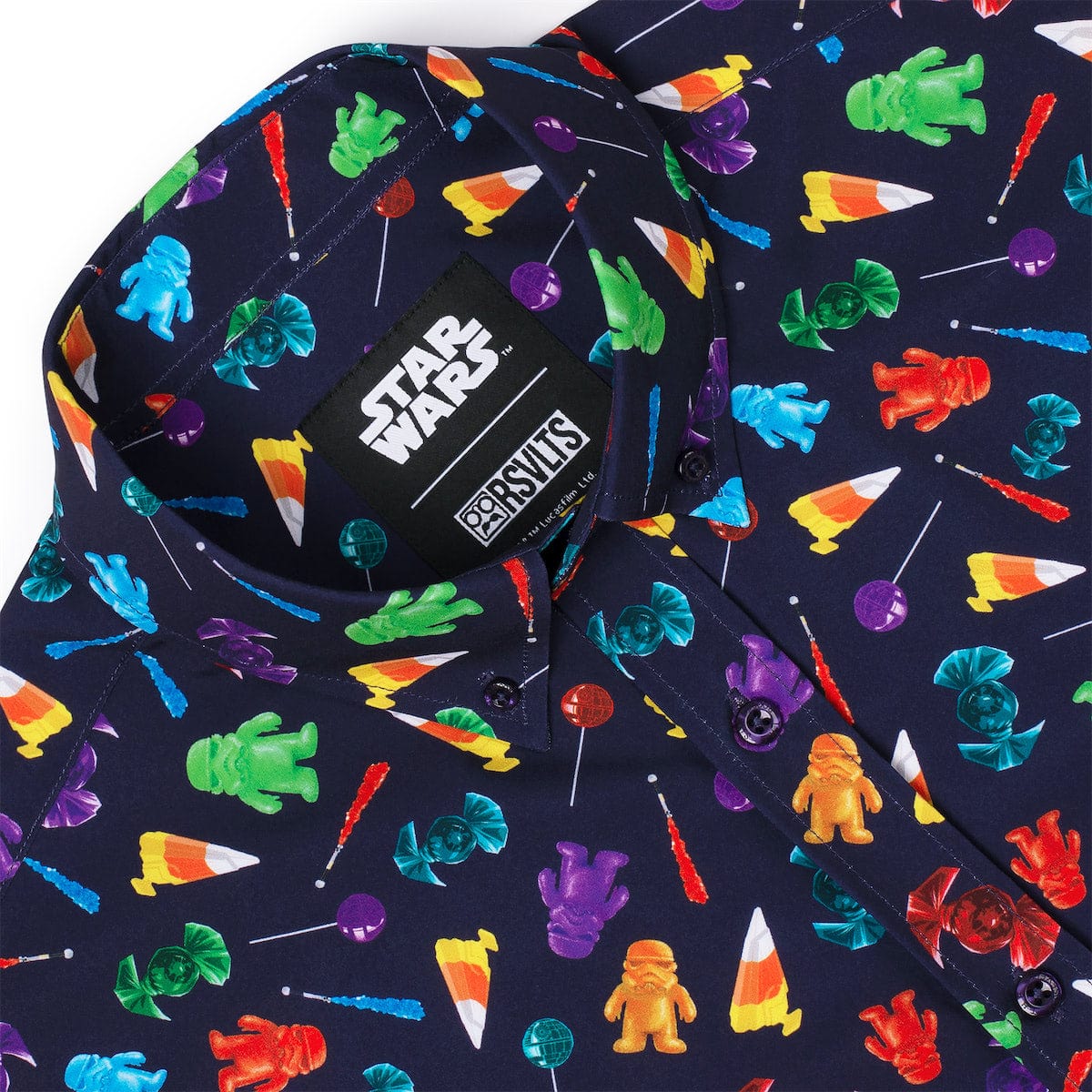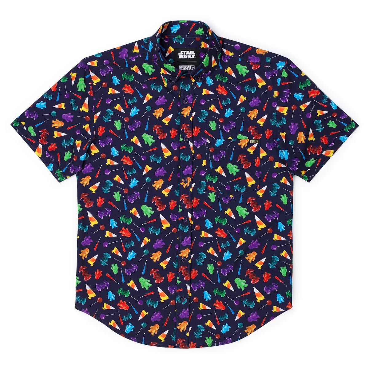 Your trick-or-treat bag just went supernova – in the sweetest way possible. Candy corn Star Destroyers, gummy Ewoks, rock candy Lightsabers™, and more galactic goodies unleash a confection-fueled frenzy across this KUNUFLEX™ button down.