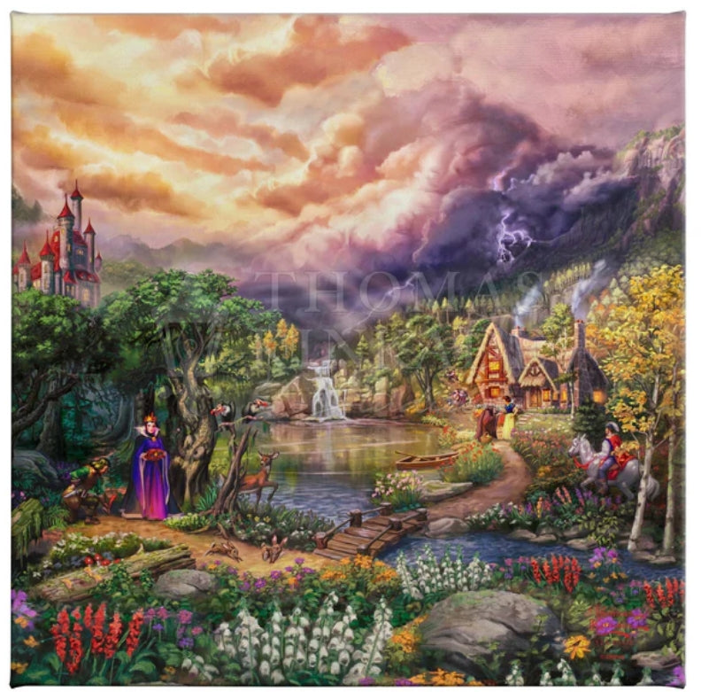 Disney’s classic film Snow White and the Seven Dwarfs illustrates the story of how a resilient and kindhearted young princess overcame the jealousy of her vain stepmother. Painted in our signature narrative panorama style, Thomas Kinkade Studios presents this story from the villain’s perspective in Disney’s The Evil Queen.